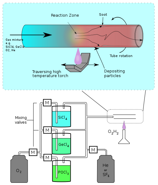 Das MCVD (modified chemical vapor deposition) -Verfahren wurde 1974 von den Bell Labs entwickelt. Dabei wird eine gasförmige Mischung aus SiCl4 (Siliziumchlorid), GeCl4 (Germaniumchlorid) und anderen chemischen Substanzen in ein Quarzglasrohr (Mantel) eingeführt. Das Rohr wird außen gedreht und erhitzt, um Silizium und Germanium zu oxidieren und SiO2 (Siliziumdioxid) und GeO2 (Germaniumdioxid) zu bilden, die im Quarzglasrohr verbleiben und den Hauptteil der optischen Faser bilden.