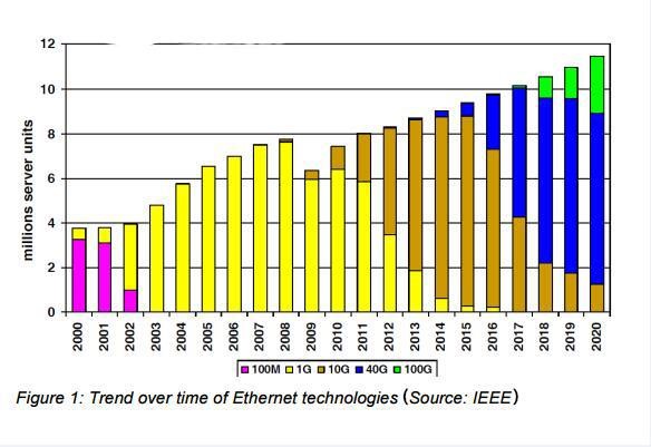 Aus verschiedenen Gründen wachsen die Datenmengen weltweit exponentiell. Der Bedarf an Bandbreite steigt kontinuierlich. Obwohl die aktuellen Anforderungen an die Datenmengen für die Hauptverkabelung noch bei 10 GbE liegen, wird der Entwicklungstrend der Datenkapazität die Einführung zukünftiger Technologien wie 40 GbE und 100 GbE erfordern (Abbildung 1). Daher muss das Rechenzentrum so schnell wie möglich bereit sein, um ausreichend Unterstützung für kommende technische Anforderungen zu bieten. Um dieser Nachfrage gerecht zu werden, sind auf dem Markt 40G QSFP+-Lichtmodule, MTP/MPO-Glasfaser-Patchkabel und andere damit verbundene Produkte aufgetaucht. Sie spielen eine wichtige Rolle bei der hochdichten Verkabelung von Rechenzentren. Dieser Artikel konzentriert sich auf das MTP/MPO-Glasfaser-Patchkabel/-Jumper im Rechenzentrum.
