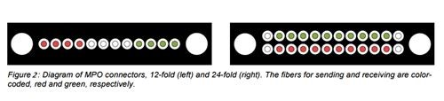 Wie bereits erwähnt, steigt die Anzahl der Netzwerkverbindungen in Rechenzentren rasant an. Die Verwendung herkömmlicher Lichtwellenleiterkabel verringert den Platzbedarf im Rechenzentrum und erhöht gleichzeitig die Schwierigkeit des Datenzentrum-Managements. Um dieses Problem zu lösen, muss das Rechenzentrum eine hohe Dichte bei der Verkabelung erreichen. Das MTP/MPO-Glasfaser-Patchkabel/-Jumper mit 12 oder 24 Fasern in einer einzigen Schnittstelle (Abbildung 2) hat sich als praktikable Lösung erwiesen. Der MTP/MPO-Mehrfaser-Steckverbinder erfüllt den Standard 40GBASE-SR4 und 100GBASE-SR10 und kann 12 oder 24 Fasern in einem Steckverbinder mit der gleichen Größe wie ein SC-Steckverbinder aufnehmen. Dadurch bieten MTP/MPO-Glasfaser-Patchkabel/-Jumper eine bis zu 12- oder 24-fache Dichte und sparen Strom und Rack-Platz.