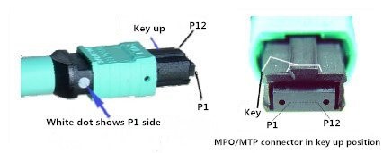 MTP/MPO-Glasfaser-Patchkabel/-Jumper bestehen aus MTP/MPO-Steckverbindern, Lichtwellenleiterkabeln und anderen Steckverbindern wie z. B. LC-Steckern, die bei einigen MTP/MPO-Glasfaser-Patchkabeln ebenfalls verwendet werden können. Das Lichtwellenleiterkabel verwendet in der Regel OM3 und OM4, das für die Laser-optimierte Mehrmodenfaser ausgelegt ist. Im Gegensatz zu herkömmlichen Steckverbindern müssen MTP/MPO-Steckverbinder sorgfältig verwendet werden, um eine ordnungsgemäße Verbindung sicherzustellen. Daher ist es wichtig, ein allgemeines Verständnis von MTP/MPO-Steckverbindern zu haben. Wie in der Abbildung unten gezeigt, befindet sich auf einer Seite jedes MTP/MPO-Steckverbinders eine Schlüsseltaste, die als Schlüsselposition nach oben bezeichnet wird. In dieser Richtung sind die Faseröffnungen im Steckverbinder von links nach rechts nummeriert. Diese Verbindungen werden oft als P1, P2 usw. bezeichnet. Darüber hinaus zeigt ein weißer Punkt auf den P1-Bereich, wenn der Steckverbinder eingesteckt ist.