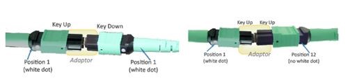 Es gibt zwei Arten von MTP/MPO-Adaptern, die hauptsächlich auf der Position der Schlüsseltaste basieren: Schlüssel nach oben - Schlüssel nach unten und Schlüssel nach oben - Schlüssel nach oben. Wenn Sie zwei MTP/MPO-Steckverbinder verbinden möchten, ist es wichtig, den richtigen Adapter auszuwählen. Dadurch wird die richtige Ausrichtung beider Enden durch den Bereich der Schlüsseltaste sichergestellt. Die folgende Abbildung zeigt die korrekte Verbindung von zwei MTP/MPO-Steckverbindern im Adapter.