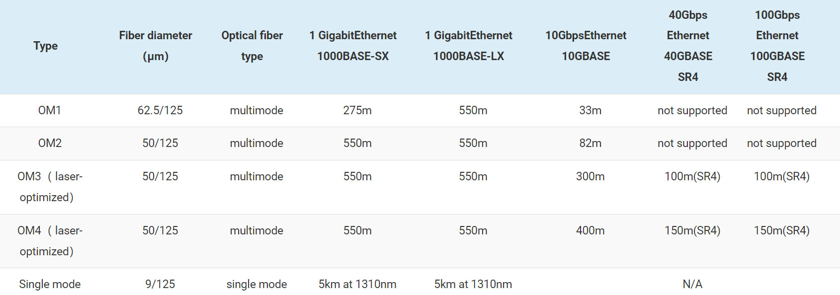 4. OM4 ist eine weiterentwickelte Version der OM3 Multimode-Faser, deren Übertragungsdistanz bis zu 550 m erreichen kann.